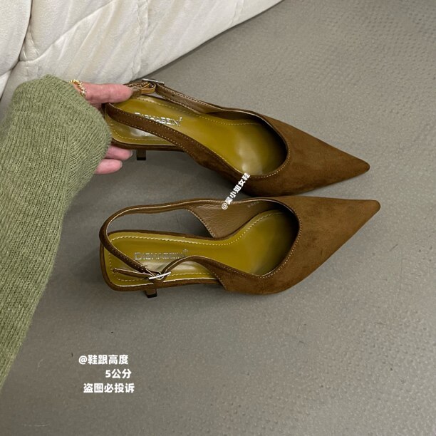 2026夏季新款包头后绊带细跟高跟鞋法式气质简约绒面尖头浅口凉鞋