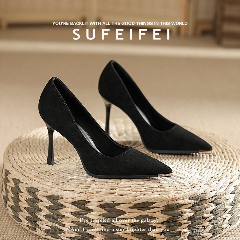 苏妃妃金属尖头细跟绒面职业高跟鞋女细跟通勤高级感不累脚工作鞋