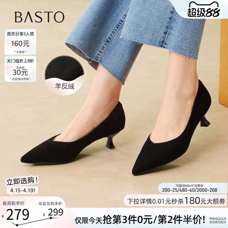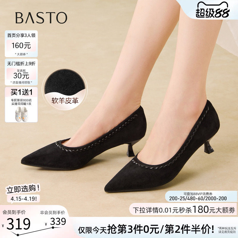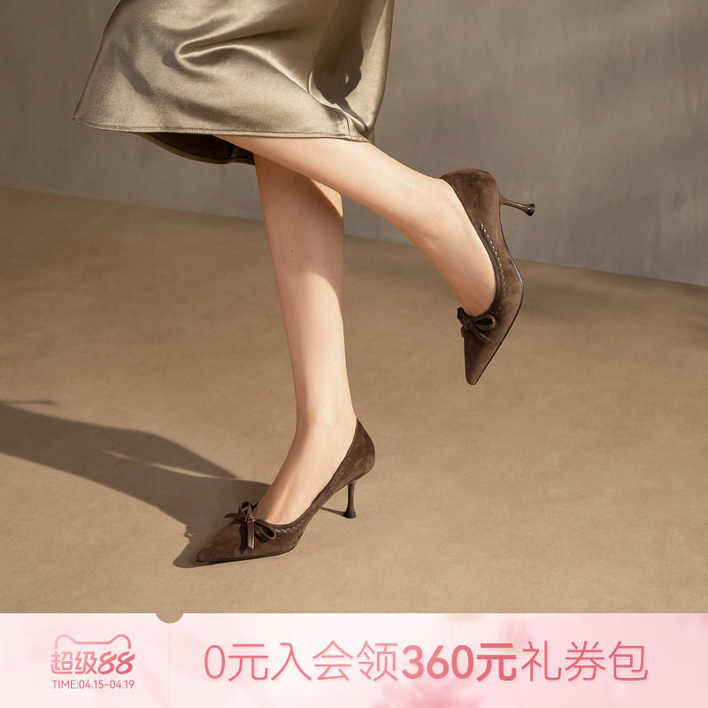 百思图2026春季新款羊皮绒面细跟高跟鞋尖头女浅口单鞋K5811AQ6