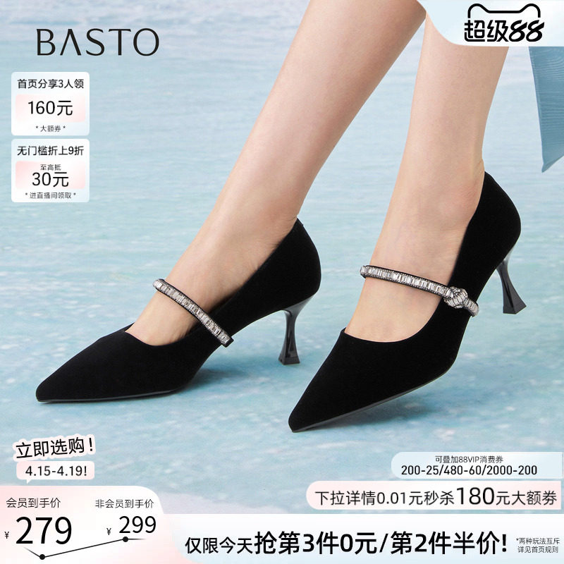 百思图26春商场新款尖头粗跟绒面高跟鞋玛丽珍法式女单鞋W0128AQ6