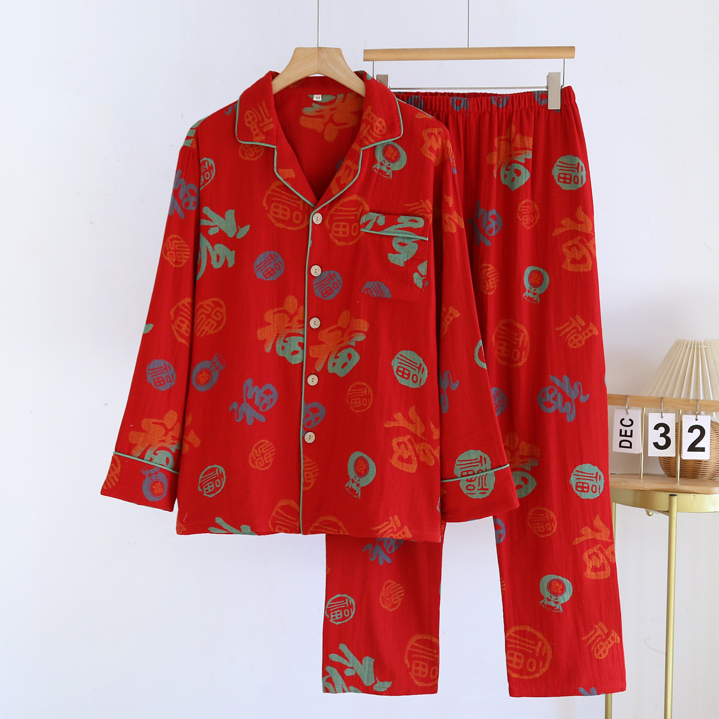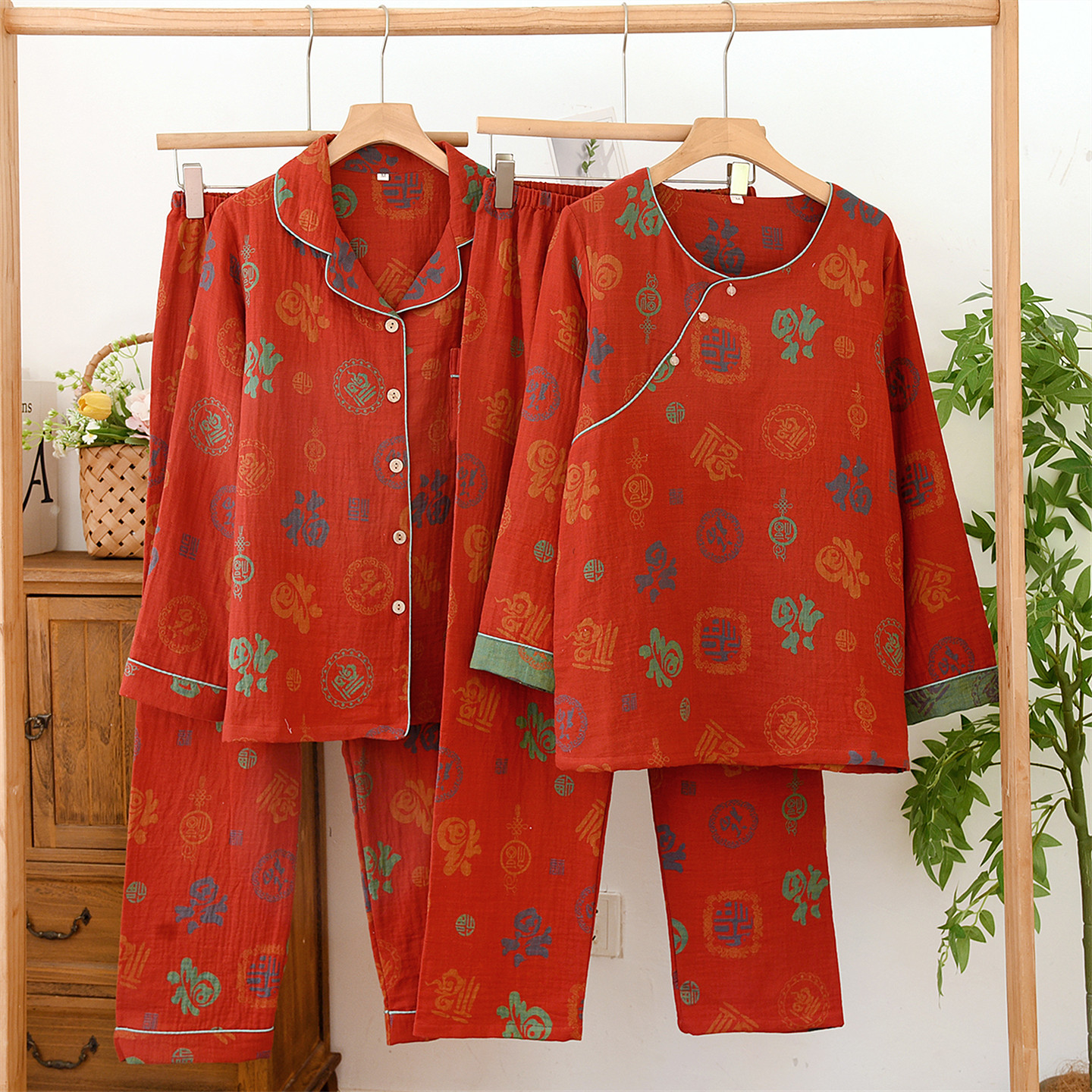 情侣本命年大红睡衣男女春秋冬纯棉双层纱布新中式百福家居服套装
