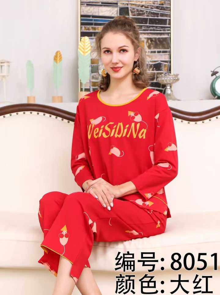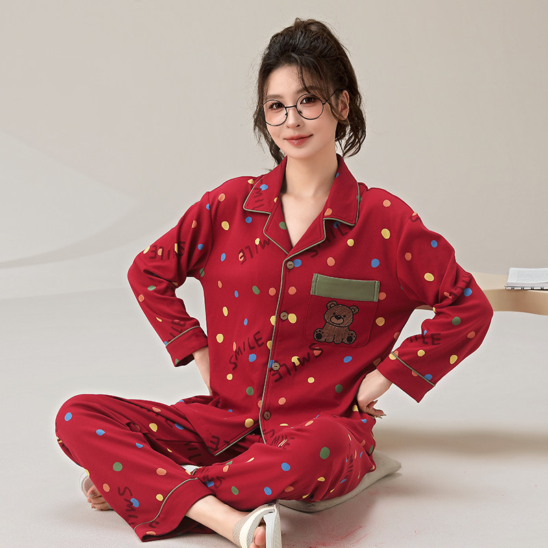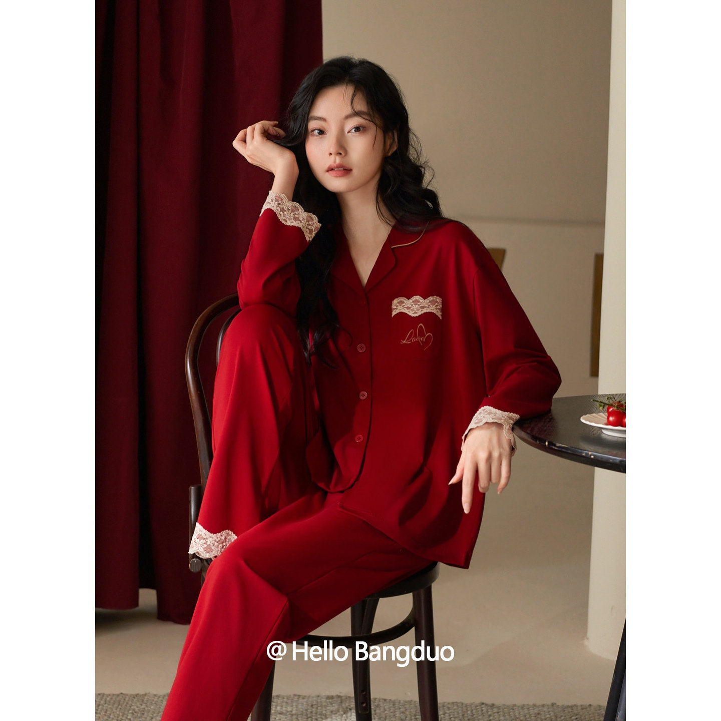 贴心女士家居服套春款舒爽棉翻领长袖起居服新年大红睡衣睡裤3082