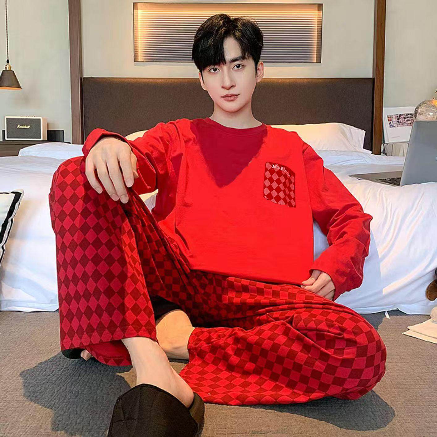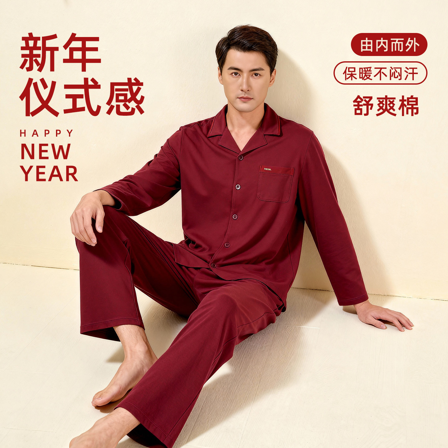 贴心男士家居服套春款舒爽棉翻领长袖起居服新年大红睡衣睡裤4106