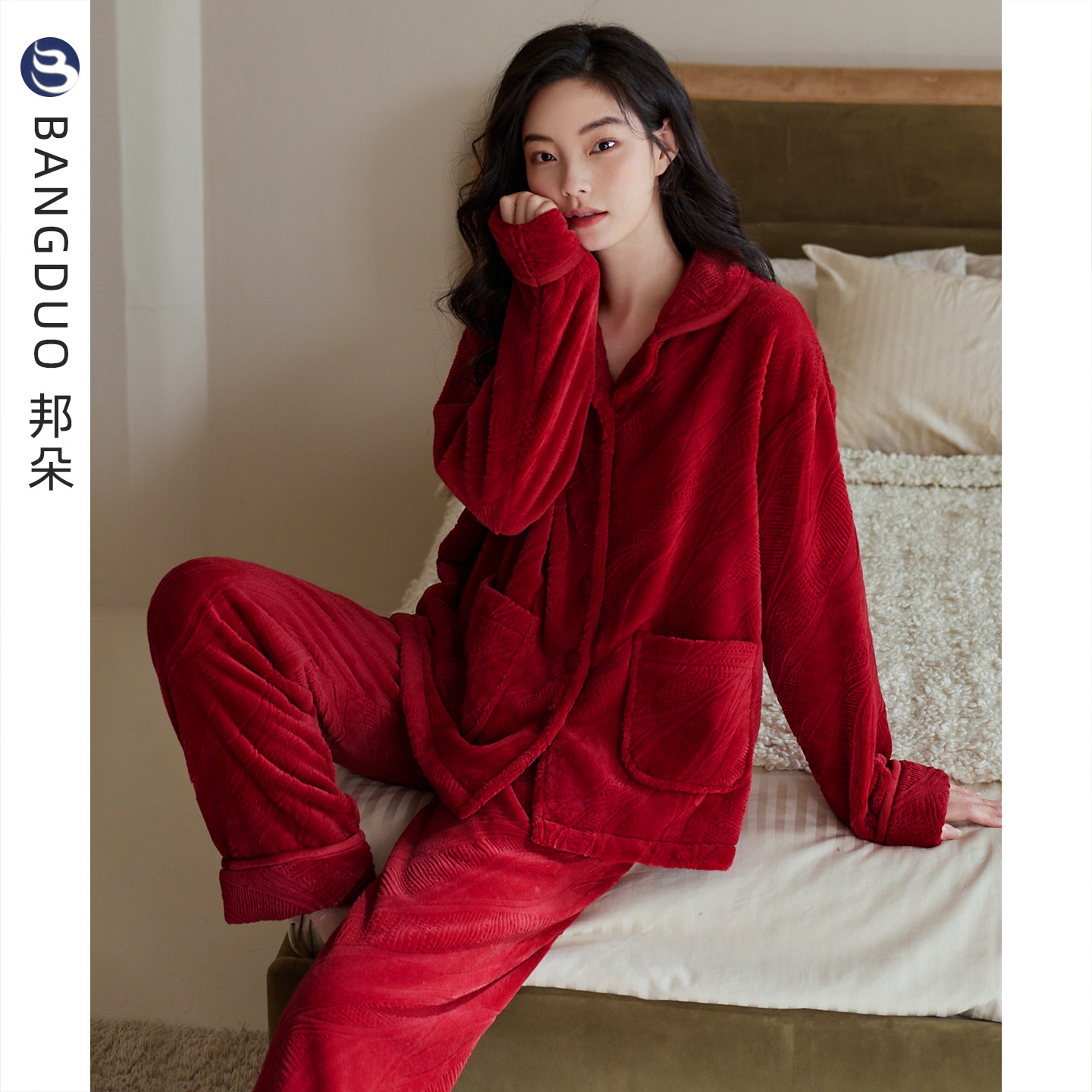 睡衣女冬季珊瑚绒加厚加绒大红色本命年秋冬法兰绒新婚结婚家居服