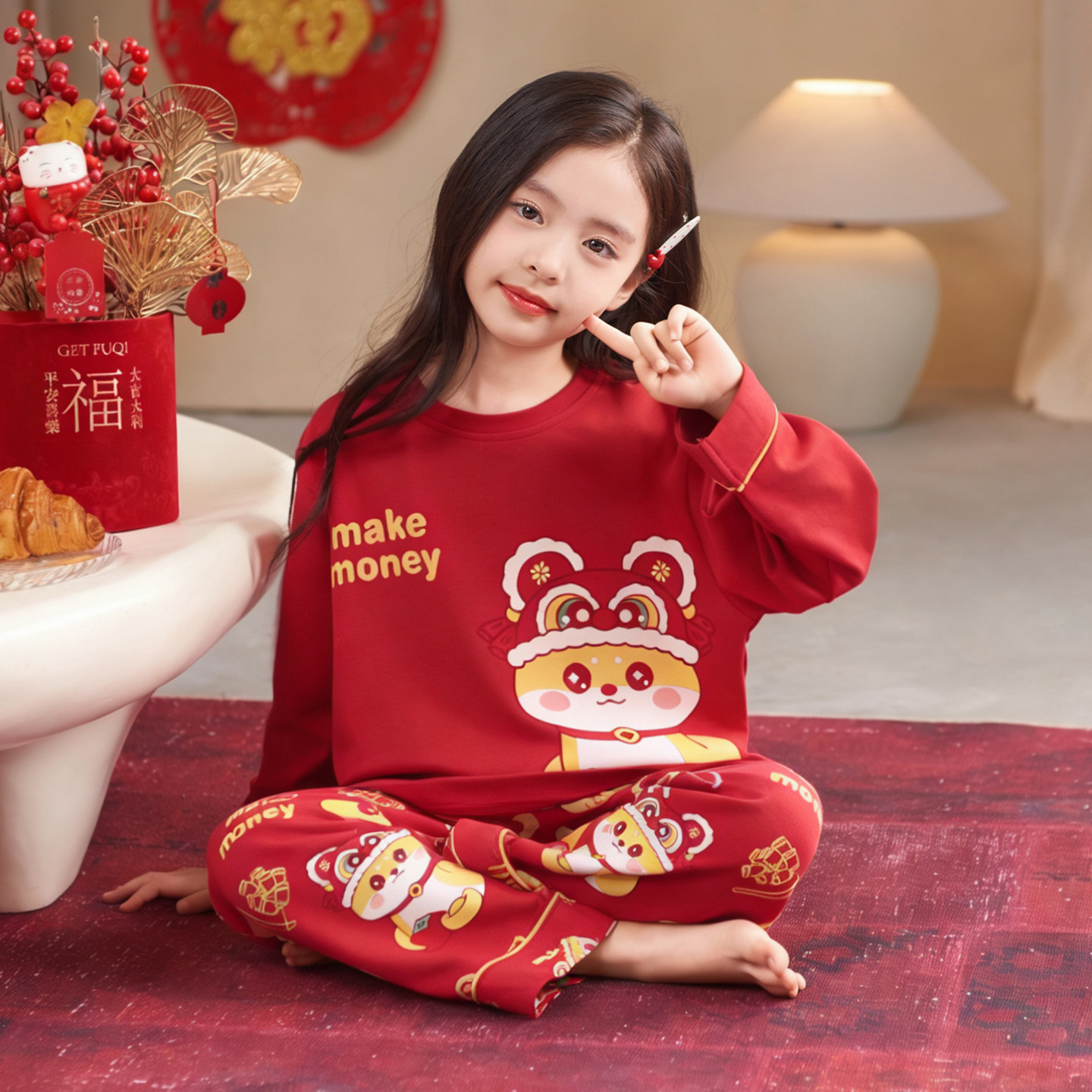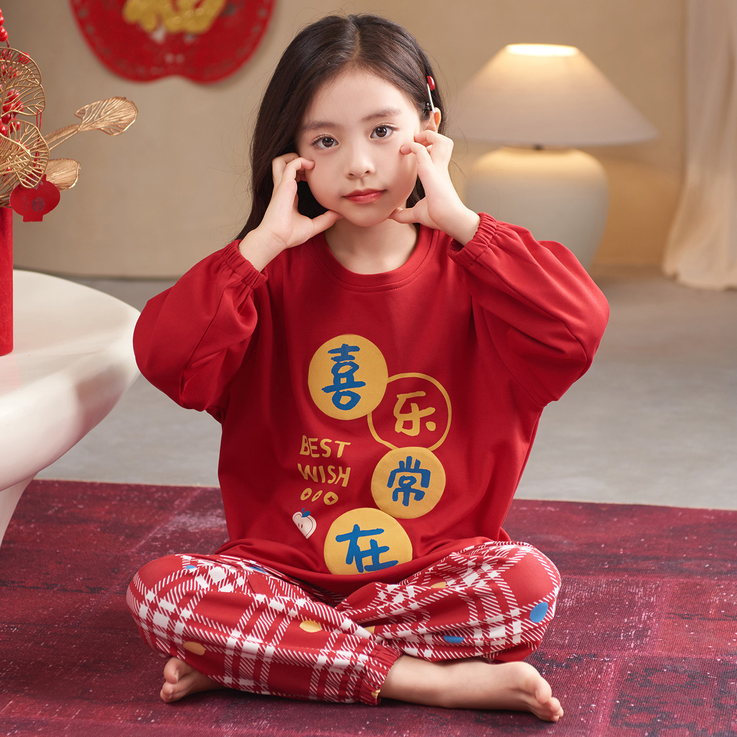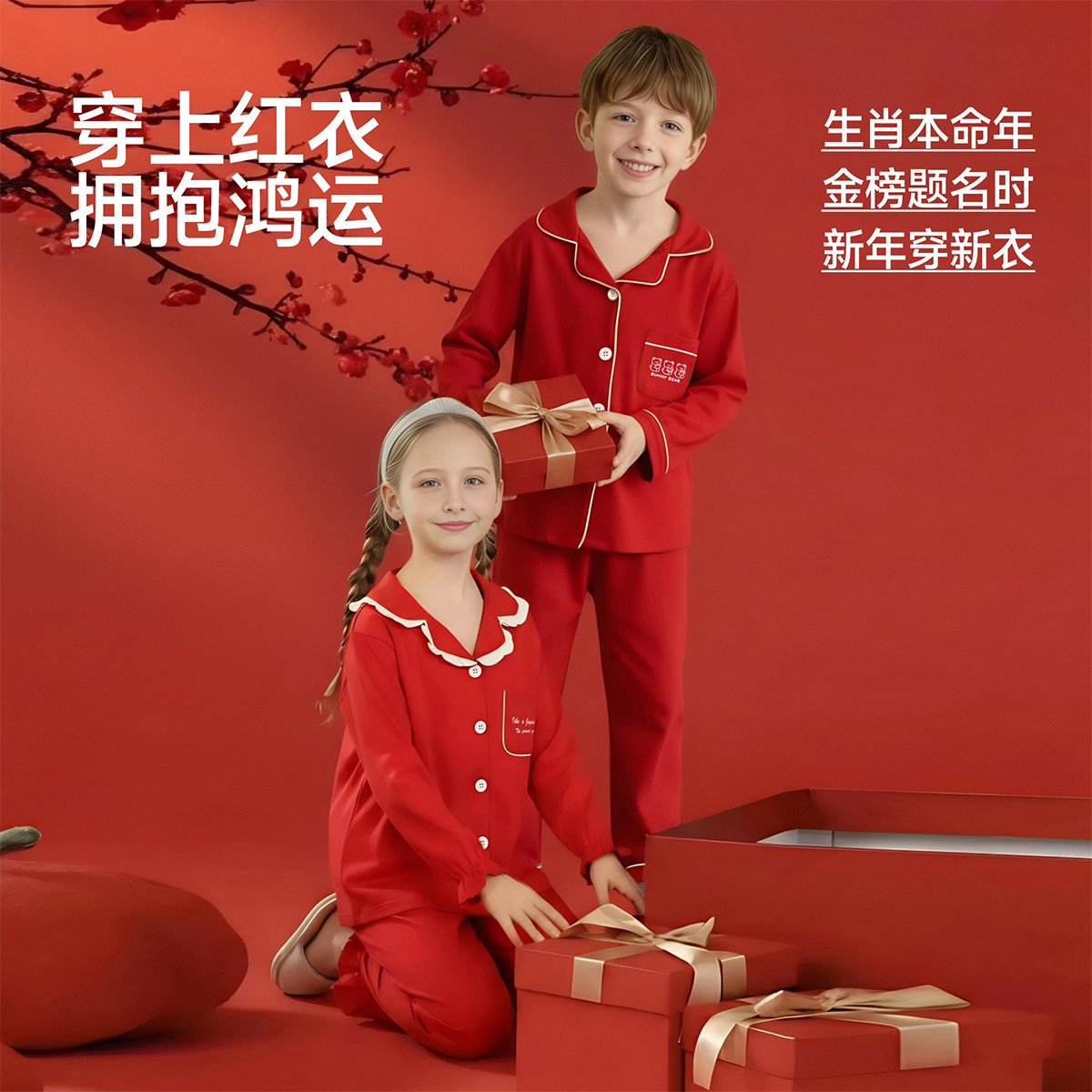 2026春季本命年亲子装儿童大红睡衣女童装圆领长袖纯棉套装家居服
