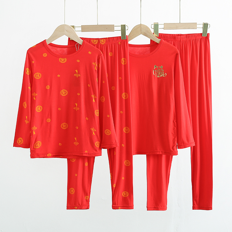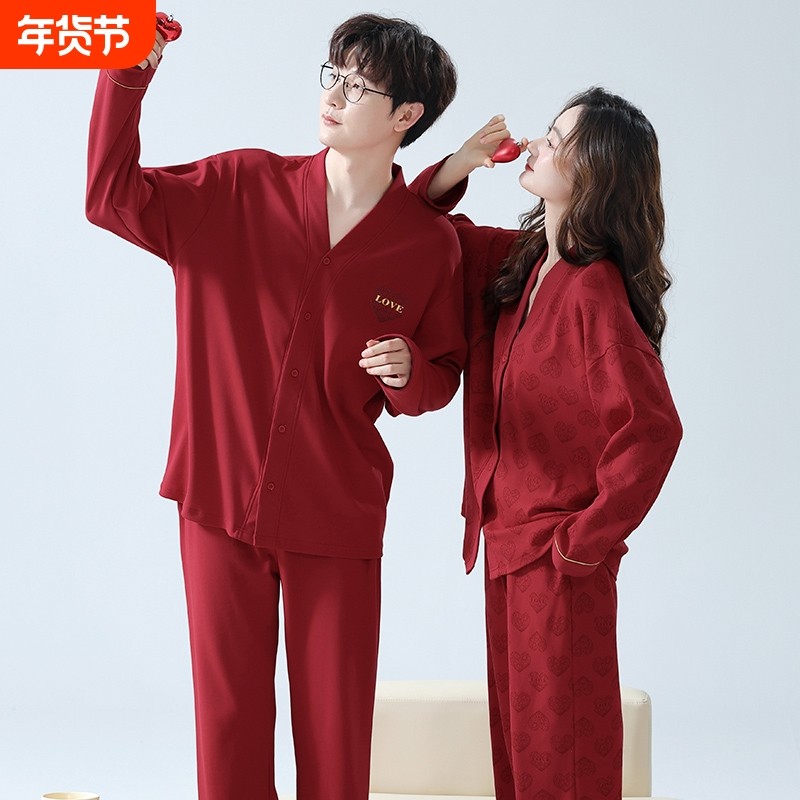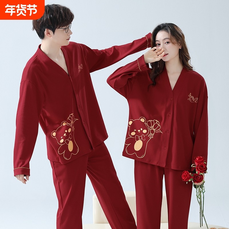 都市丽人纯棉睡衣结婚本命年大红女士家居服25年新款秋季套装男士