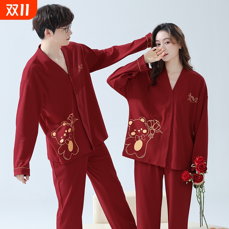 芬腾可安情侣大红睡衣女春秋加厚纯棉长袖新婚本命年夹层男家居服
