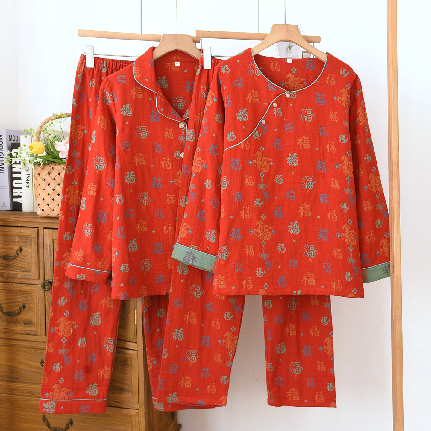 情侣本命年大红睡衣女士春秋冬纯棉双层纱布新中式百福家居服套装