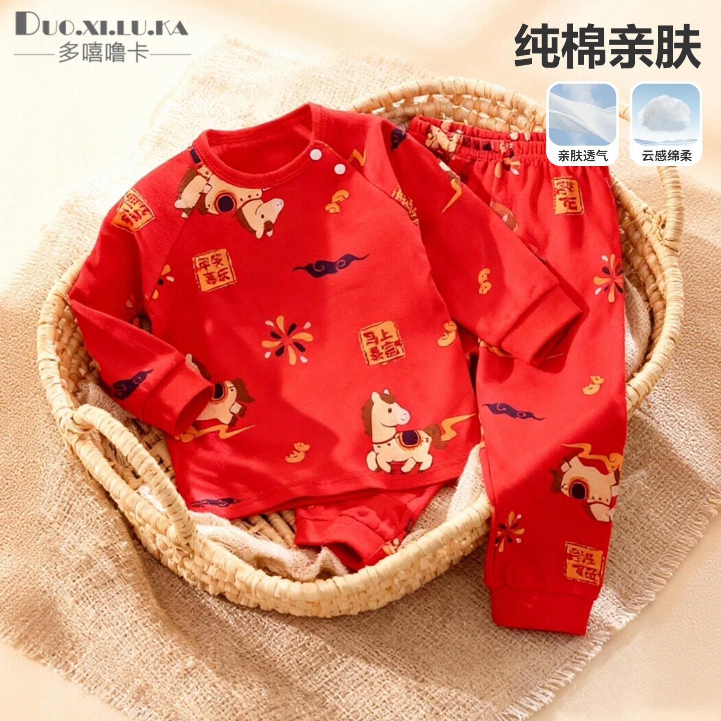 马年婴儿过年服大红睡衣儿童新年家居服纯棉女宝宝秋衣秋裤套装男