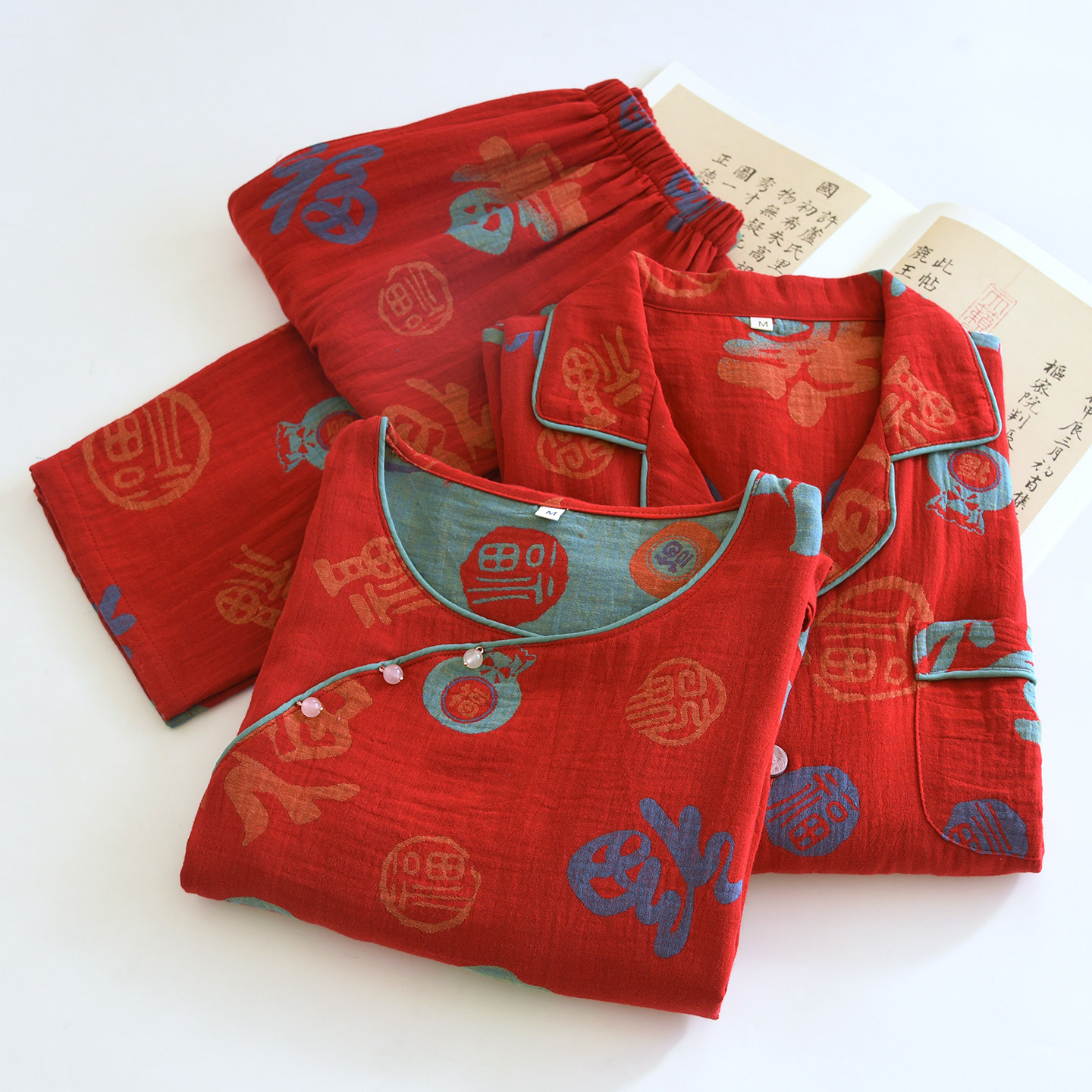 新中式双层纯棉纱布睡衣女本命年百福大红春秋冬季薄款家居服套装