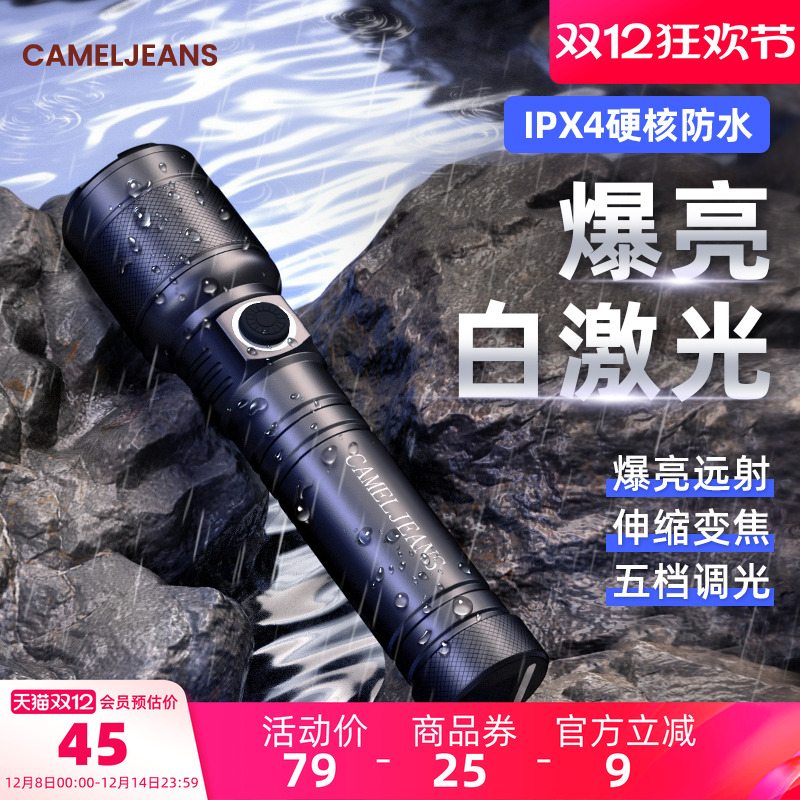 CAMELJEANS探影强光手电筒便携超亮户外防水超长续航循环充电新款
