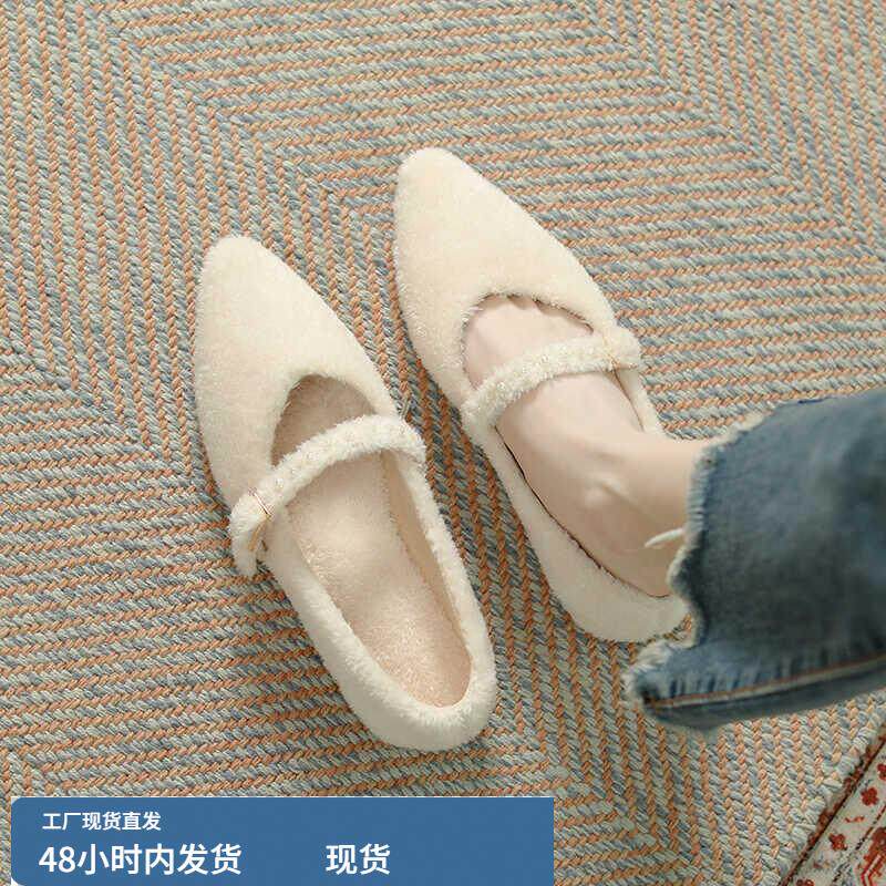 玛丽珍尖头毛毛鞋女冬外穿2025冬季新款韩版仙女风平底加绒单鞋女