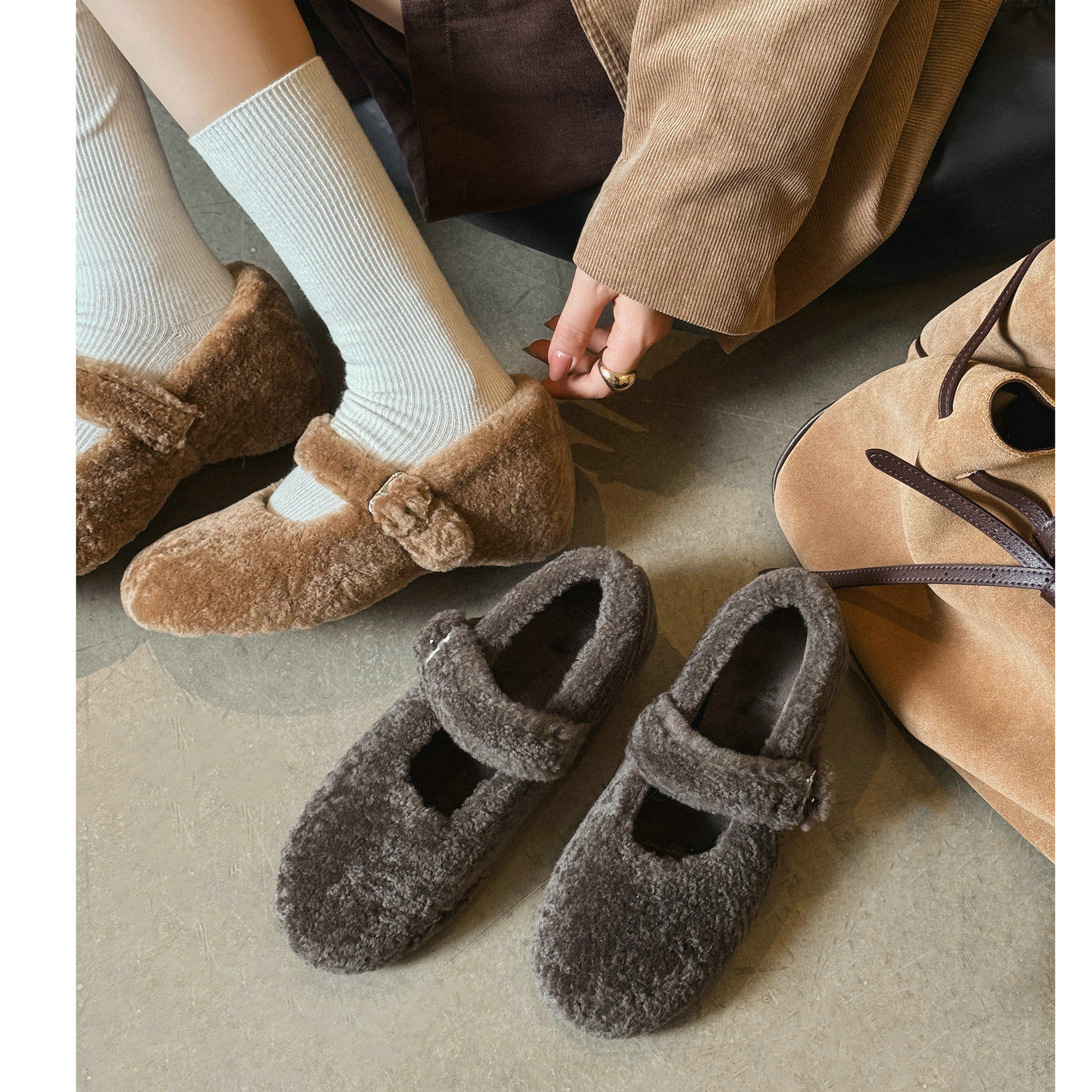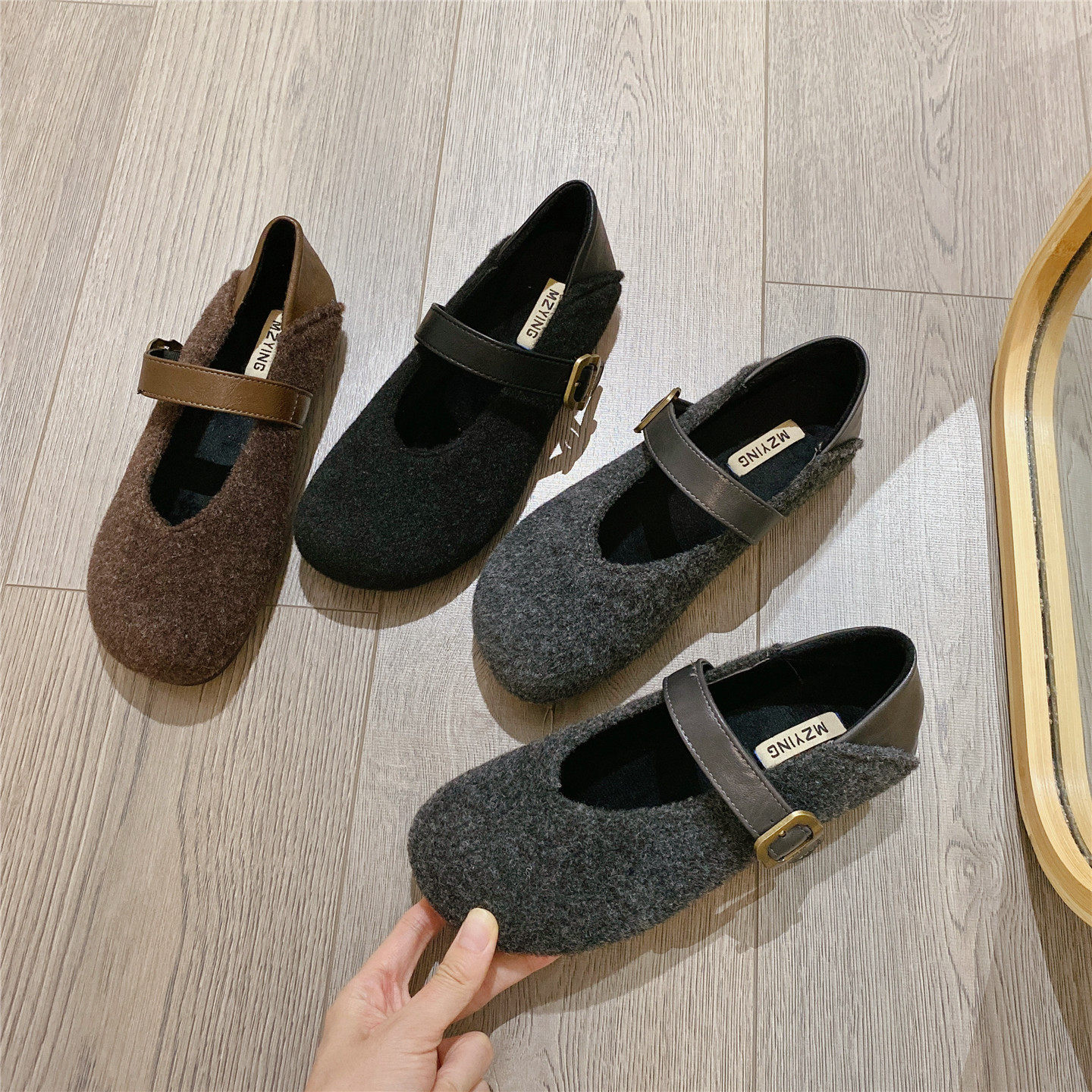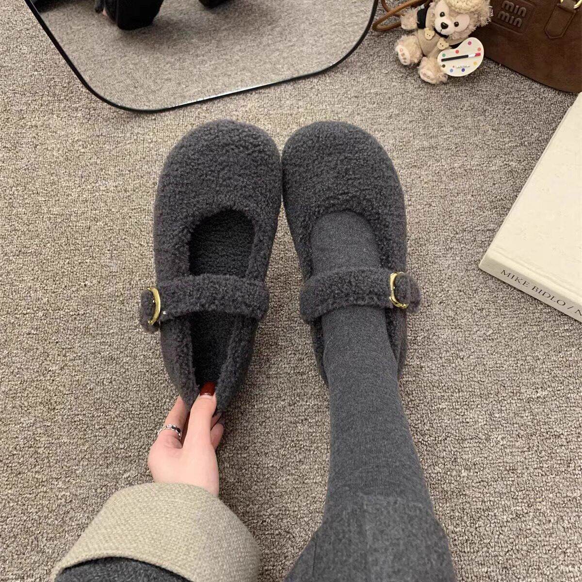 灰色玛丽珍毛毛鞋女冬外穿新款韩版呢子单鞋女平底加绒保暖棉鞋子