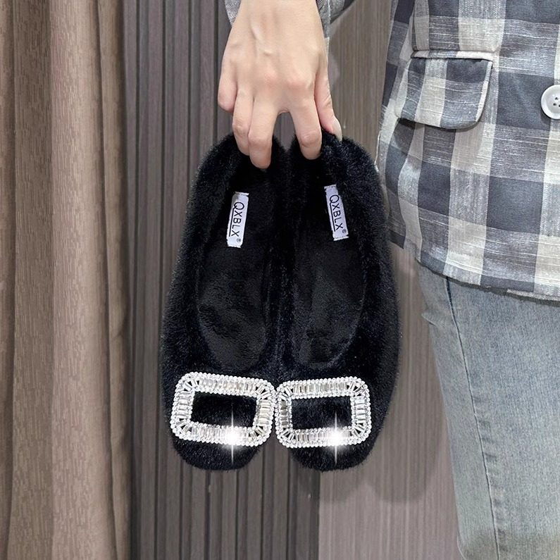 韩版秋冬加绒保暖方头浅口毛毛鞋水钻平底单鞋气质百搭外穿豆豆鞋
