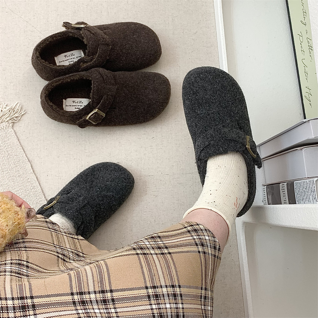 加绒勃肯鞋女冬灰色单鞋新款韩版保暖棉鞋平底毛毛鞋女外穿乐福鞋