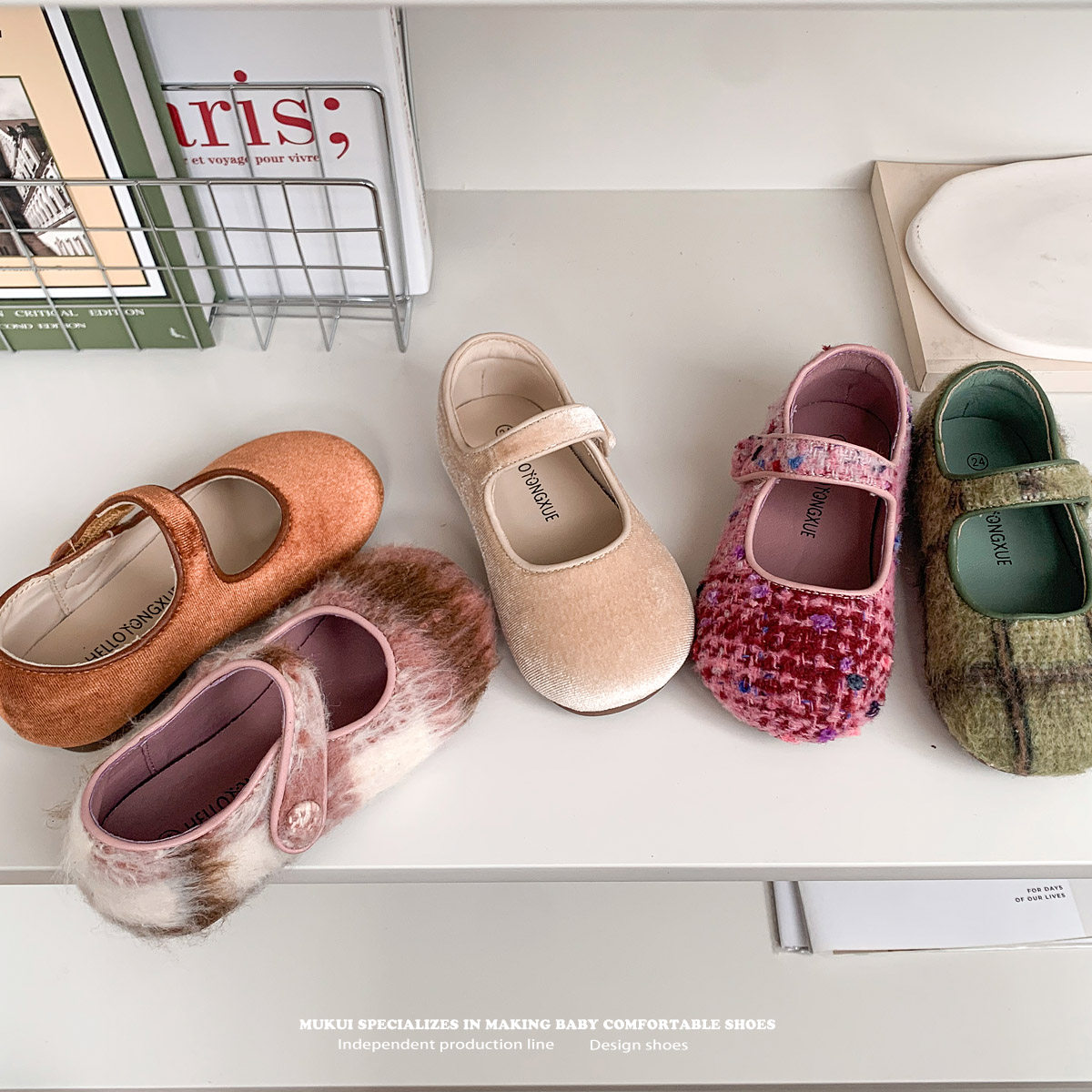 慕葵家韩版女童公主鞋毛毛鞋秋冬新款格子丝绒宝宝单鞋甜美浅口鞋
