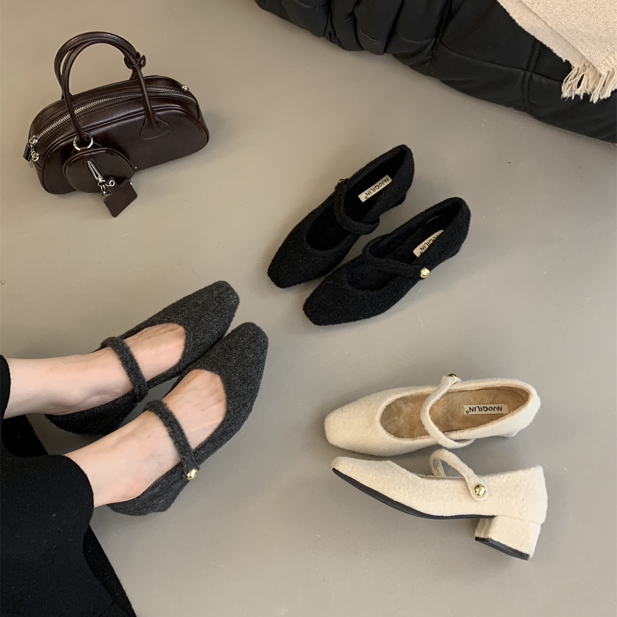 2026春灰色毛毛鞋女外穿韩版温柔仙女风粗跟玛丽珍棉鞋毛呢子单鞋