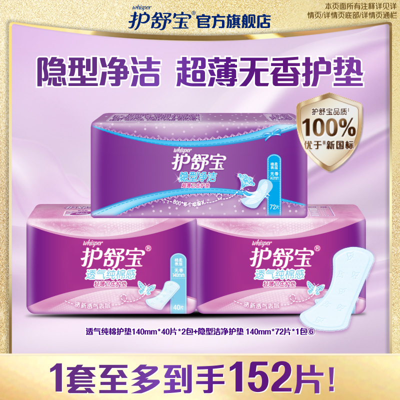 护舒宝隐型透气超薄纯棉卫生护垫无香152片组合 宝洁官方旗舰店