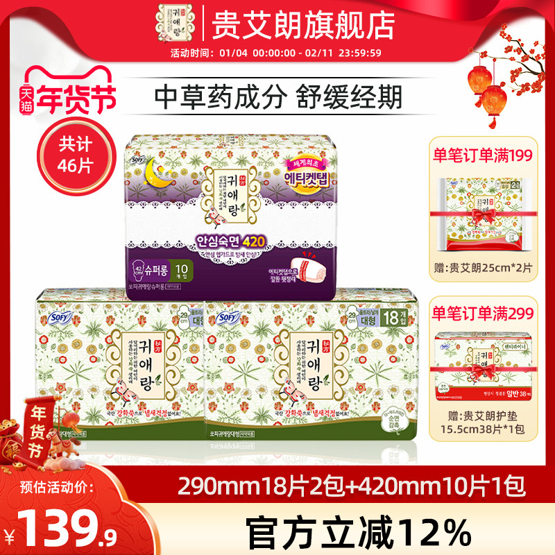 贵艾朗韩国进口LG棉柔亲肤干爽透气防侧漏草本日夜卫生巾套装46片