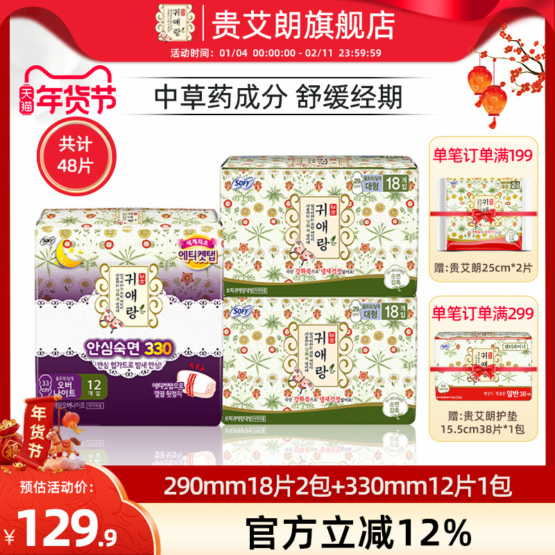 贵艾朗韩国进口LG棉柔亲肤干爽透气防侧漏草本日夜卫生巾套装48片
