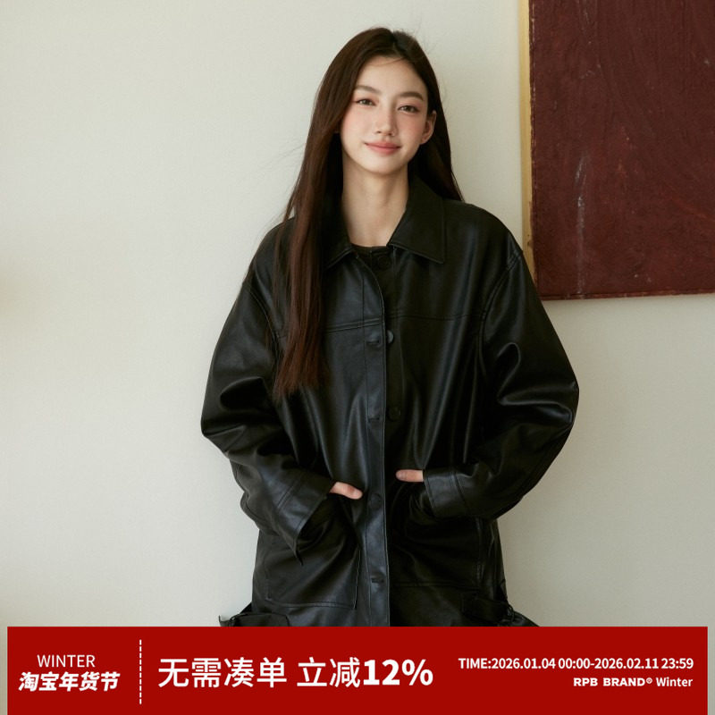 RPB BRAND韩系复古高级感黑色中长款翻领皮衣风衣外套女夹克上衣