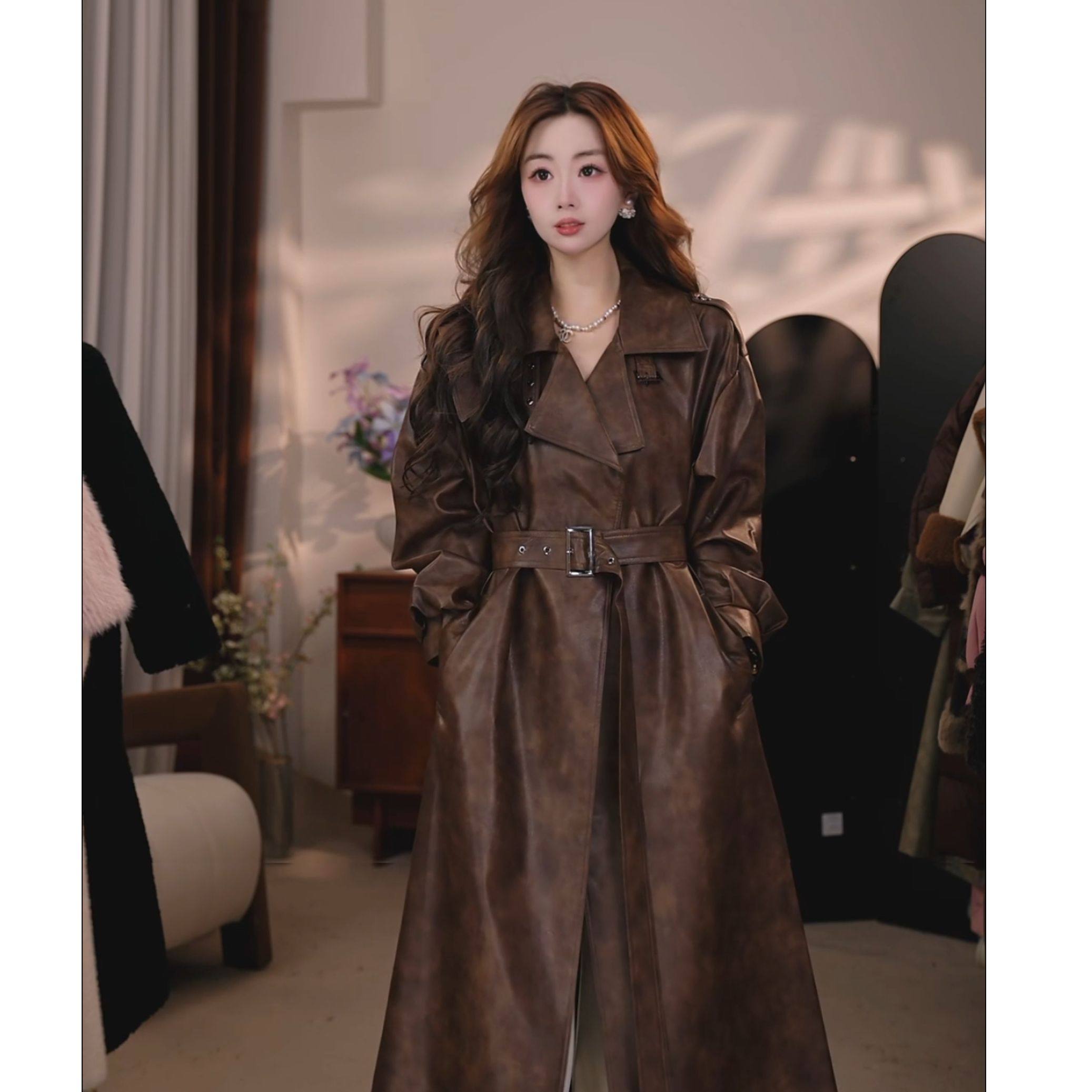LISAYU皮衣风衣加绒咖色长款腰带真皮复合皮衣超长款西装外套风衣