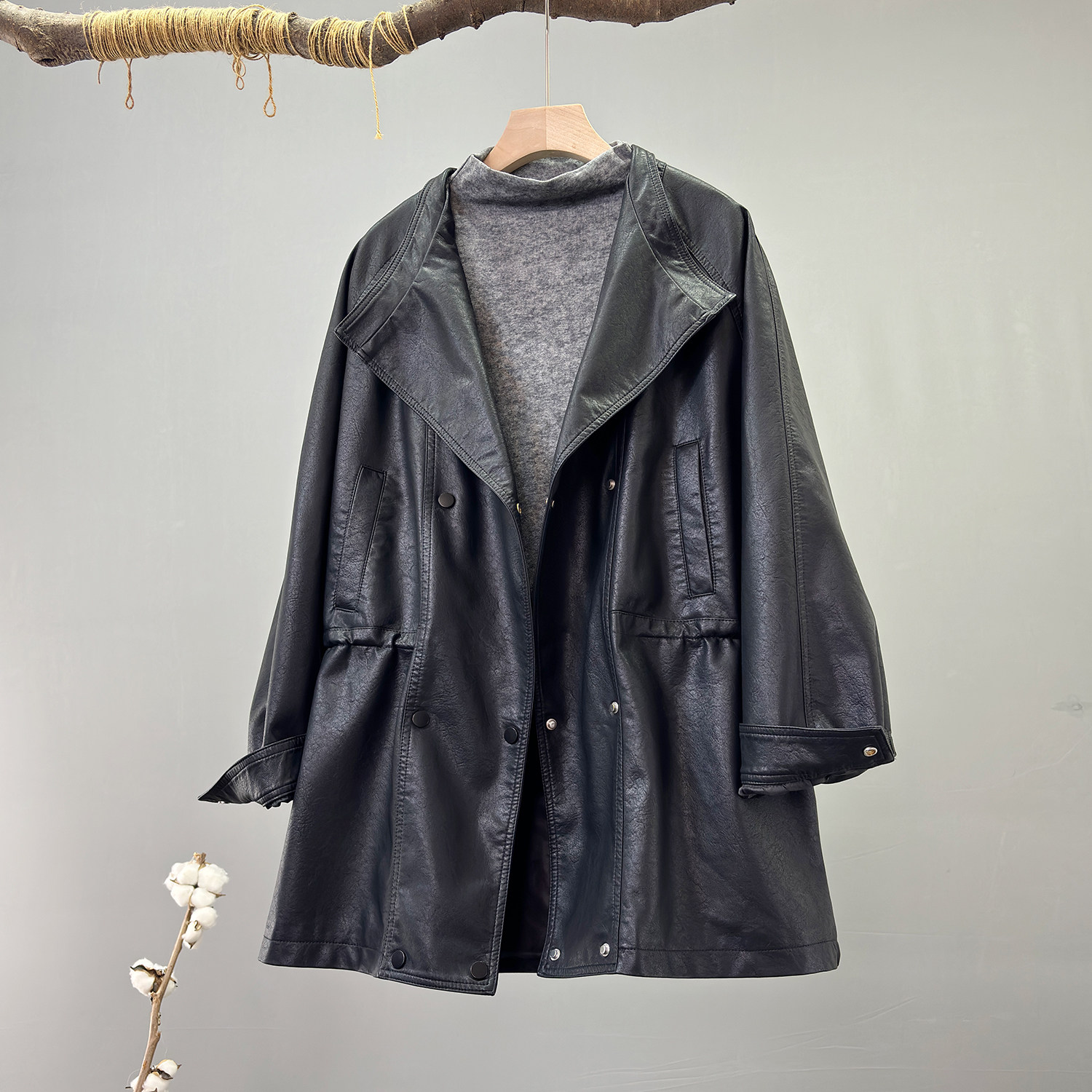 高级感翻领双排扣PU皮宽松皮衣女春装抽绳收腰气质中长款皮衣风衣