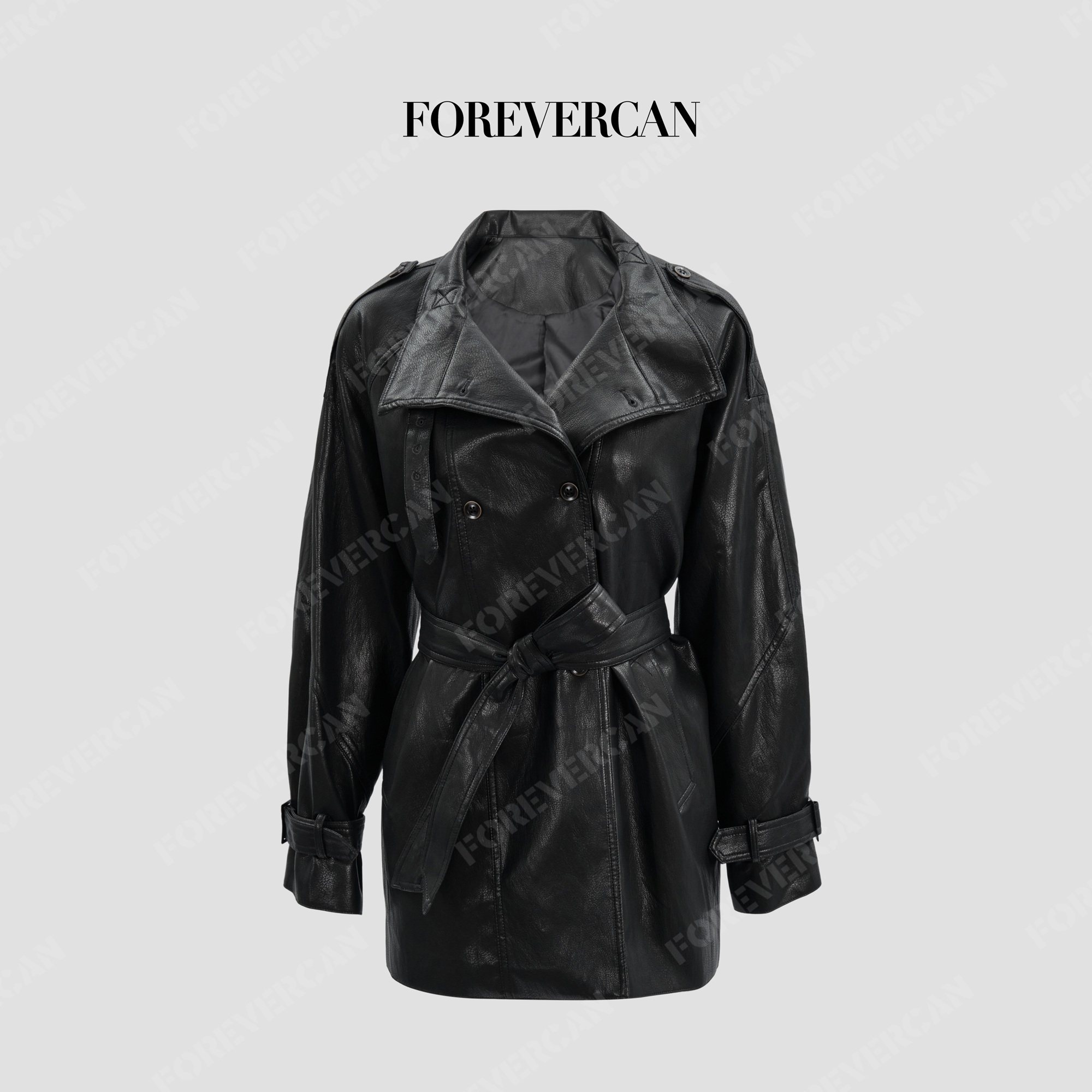 [现货]Forevercan女装新款姐感天菜立裁大翻领收腰廓形皮衣风衣