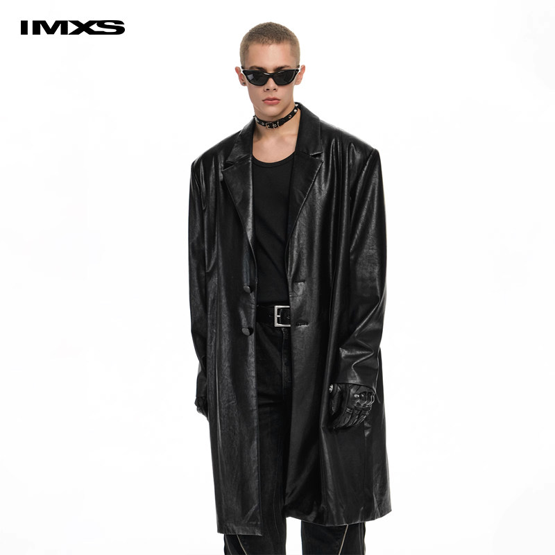IMXS“尼奥”买手店同款 黑色酷飒中长款西装廓形PU皮衣风衣外套
