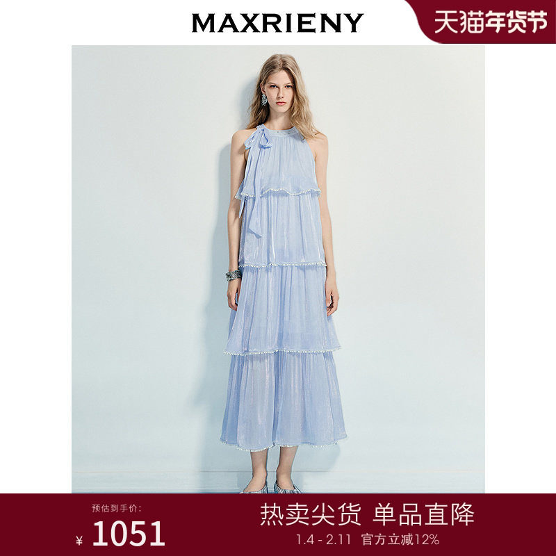 MAXRIENY优雅度假风连衣裙25夏款系带无袖挂脖A型长裙高级气质感