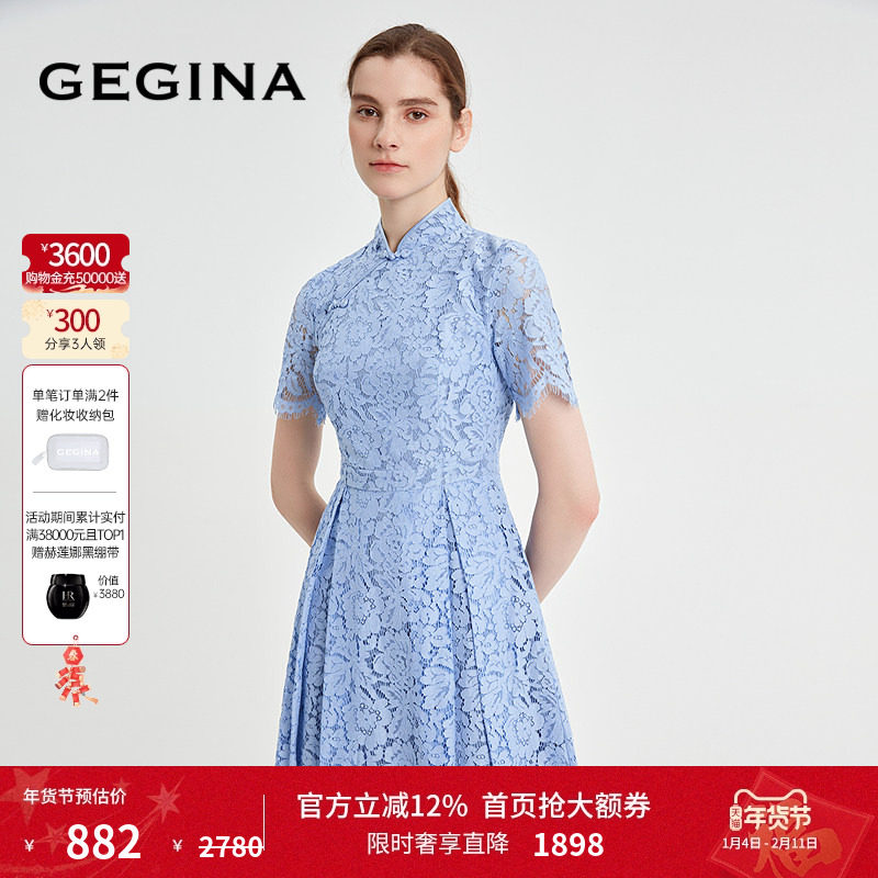 GEGINA吉吉娜专柜新中式立领短袖A型收腰气质旗袍古典蕾丝连衣裙