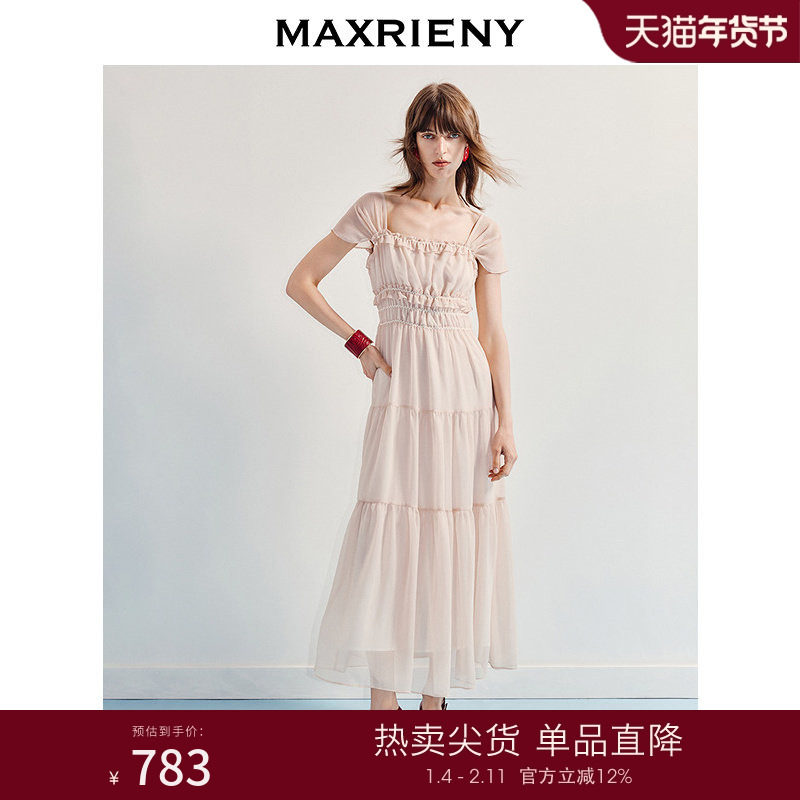 MAXRIENY优雅度假风连衣裙25夏款法式优雅抽褶收腰x型长裙气质感