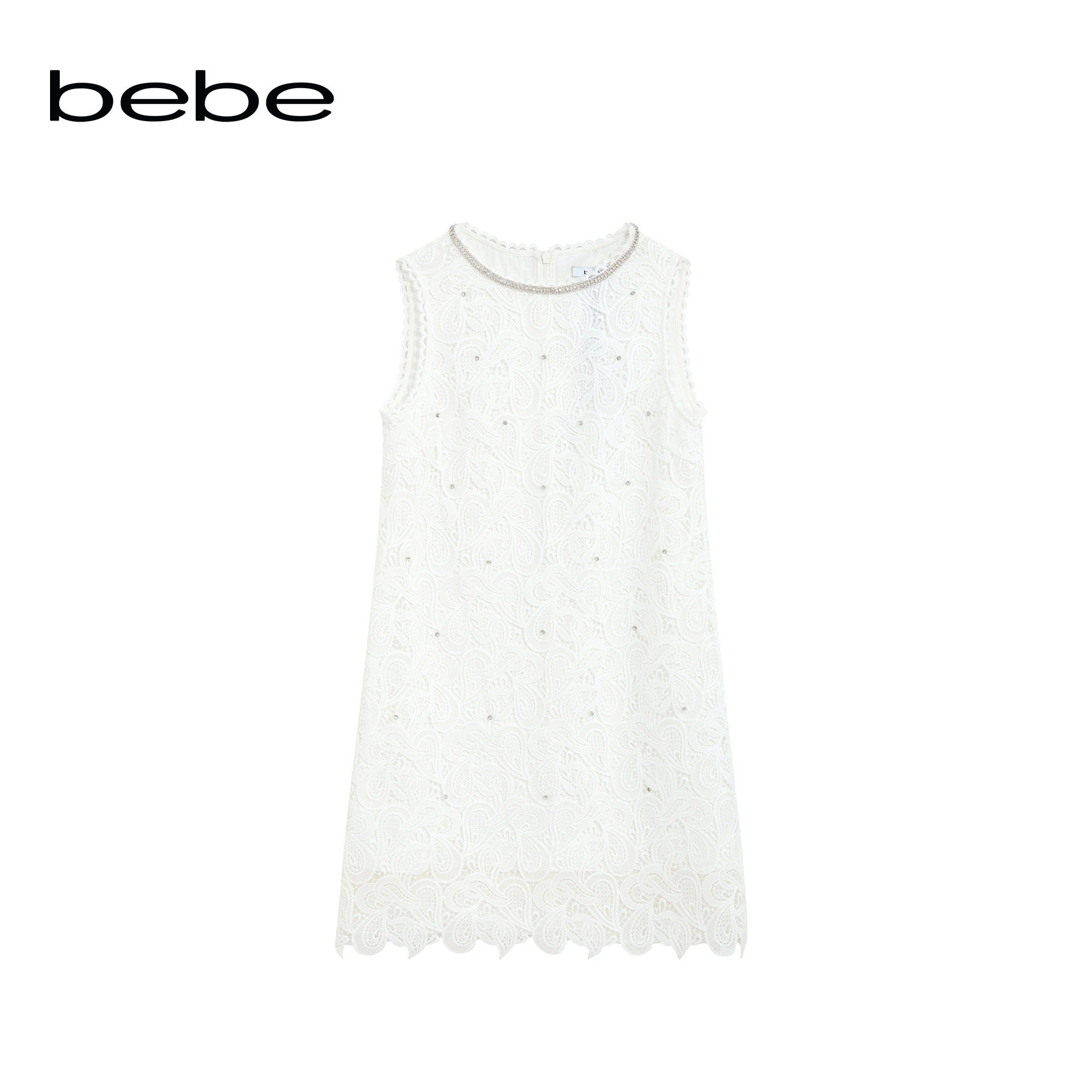 bebe2025夏季新款女士白色气质风无袖蕾丝花边H型连衣裙250002