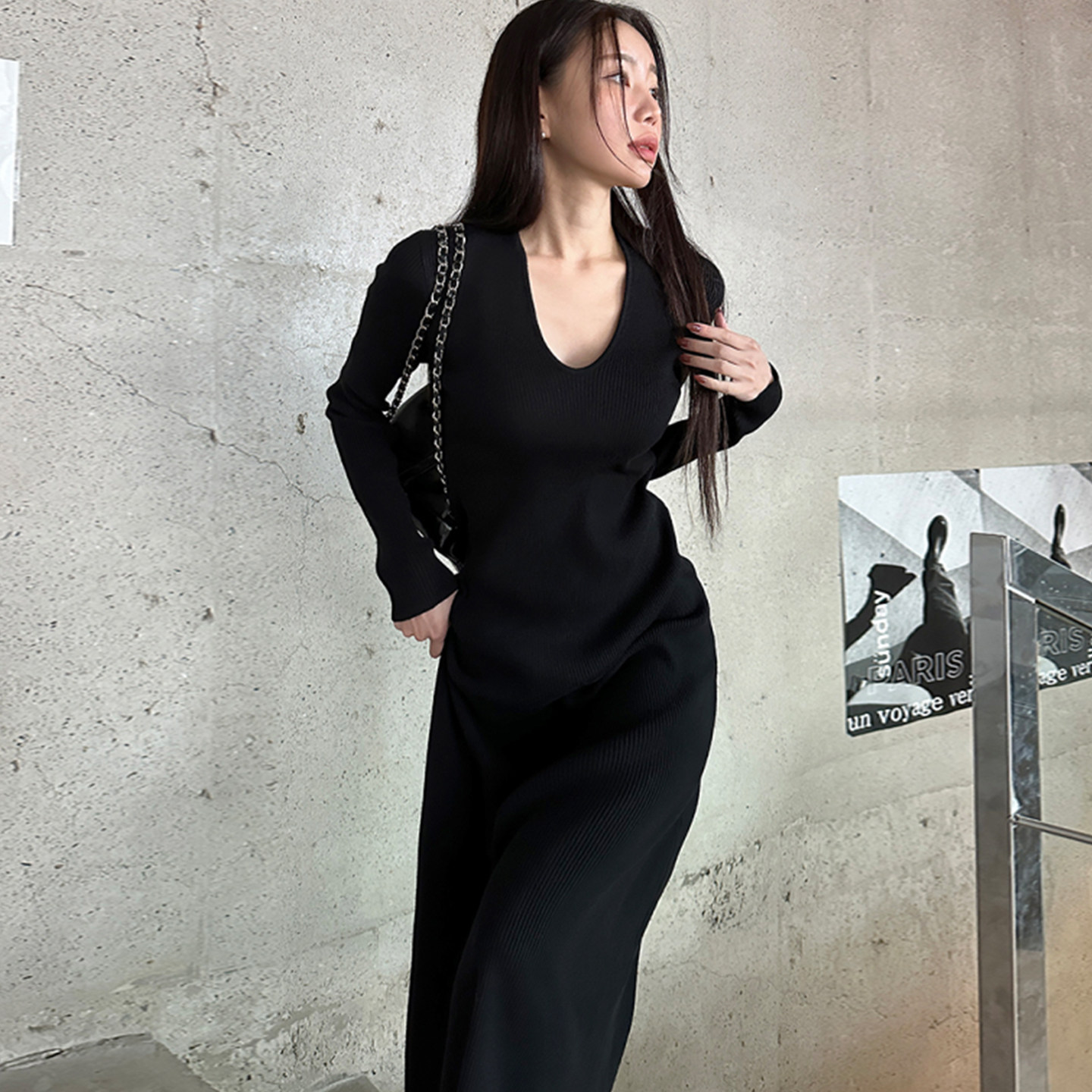 MULVAN 三穿式领型~黑色喇叭袖针织连衣裙女气质修身显瘦内搭长裙
