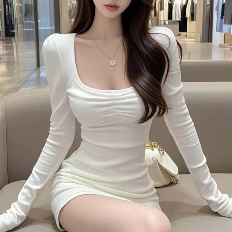 气质御姐风U型领白色长袖连衣裙轻奢高级感名媛收腰显瘦包臀裙女