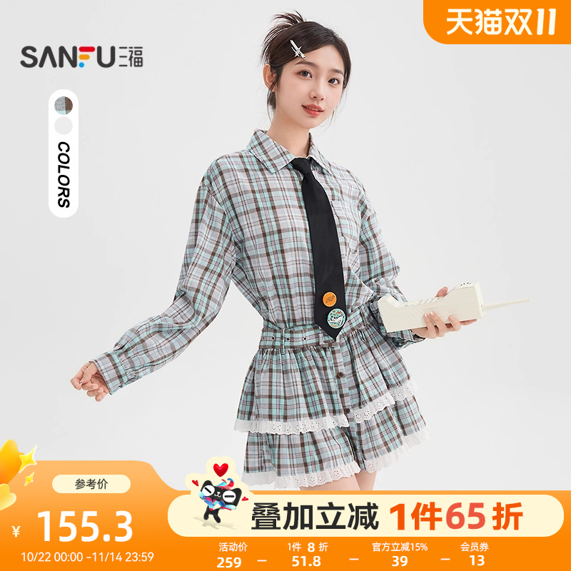 三福连衣裙女2025新款秋季蕾丝裙摆收腰衬衫蓬蓬短裙子女装504744