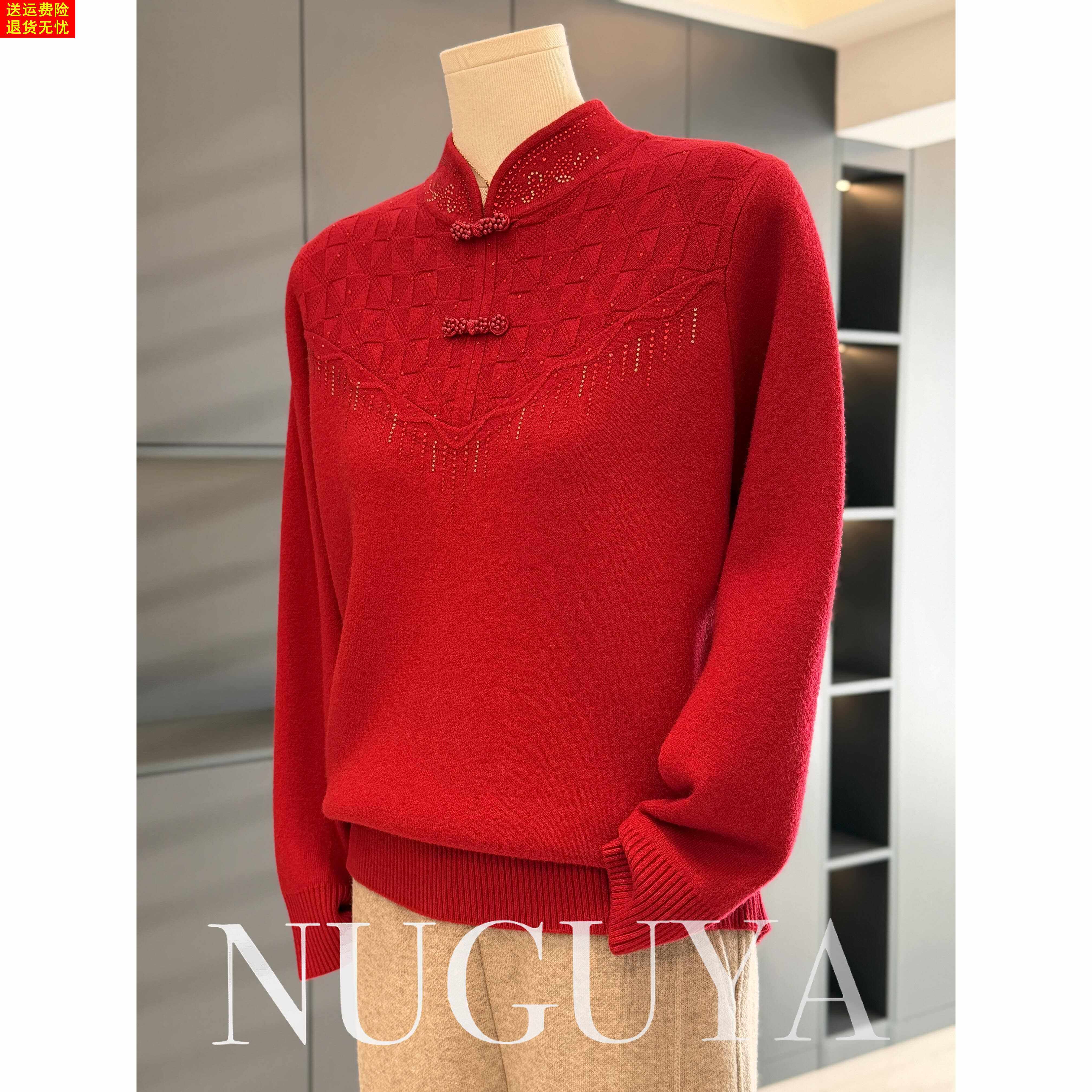 本命年红色毛衣女中老年羊毛针织长袖套头洋气宽松打底衫圆领镶钻