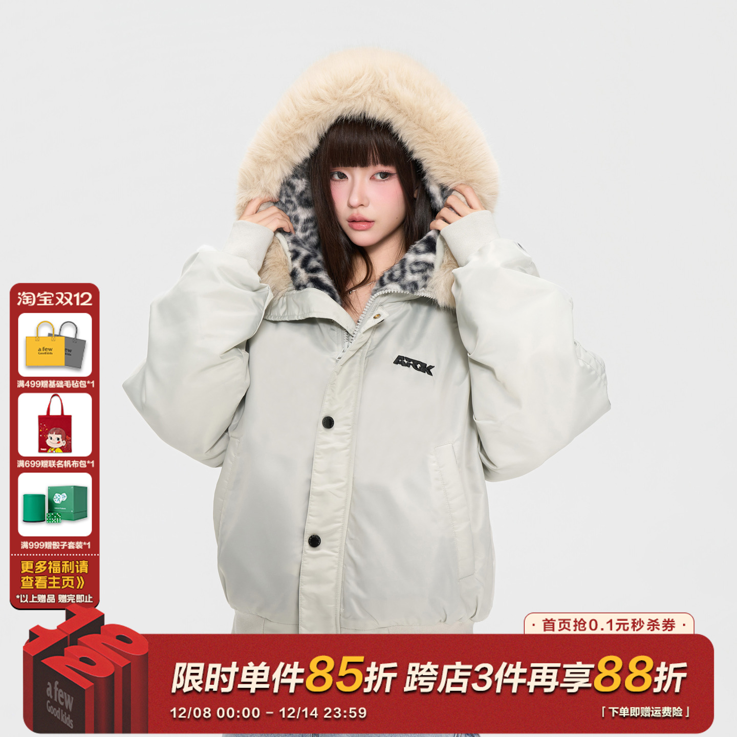 AFGK25FW豹纹貂毛连帽棉服男女冬季加厚毛领派克服情侣棉衣外套