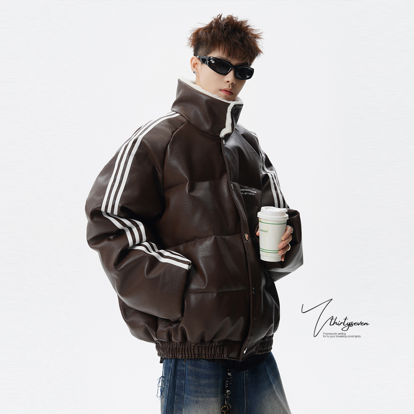 V37美式复古立领PU皮棉服男冬季潮牌宽松加厚保暖面包服情侣棉衣