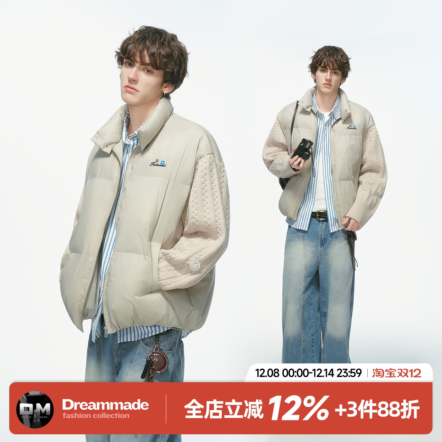 Dream made 美式编织麻花拼接针织衫棉服男冬季加厚情侣棉衣外套