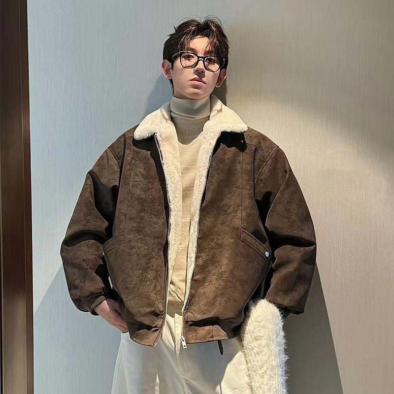 HN潮牌冬季美拉德羊羔绒PU皮重磅美式复古风棉服加绒加厚情侣棉衣