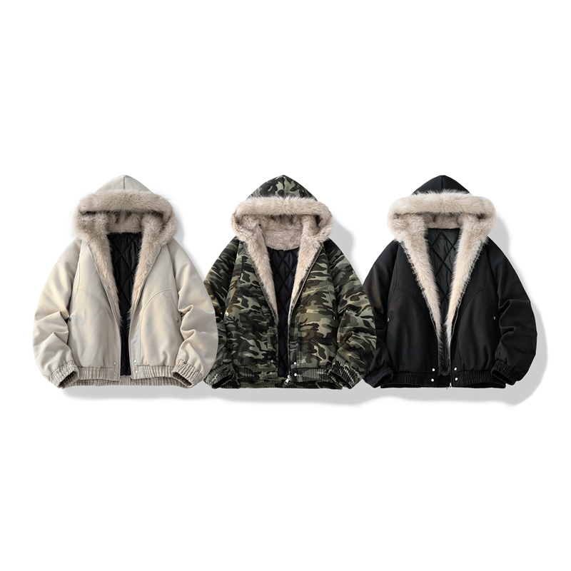 V37美式复古咖色双面穿棉服外套男冬重磅宽松加厚仿兔毛情侣棉衣