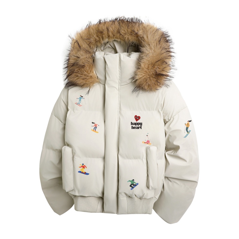 查尔斯桃心美式滑雪印花棉衣男毛领连帽冬季加厚防寒情侣棉衣外套