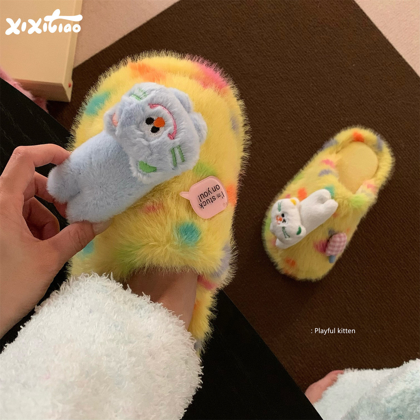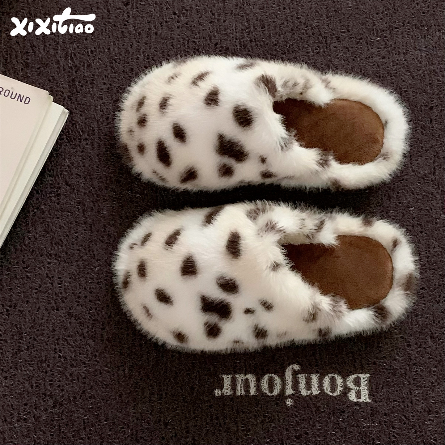 细细条 趣味可爱斑点狗纹毛毛鞋女学生防滑居家ins网红秋冬棉拖鞋
