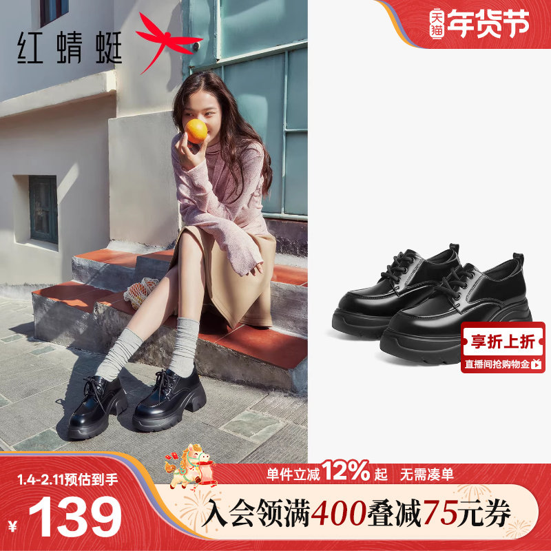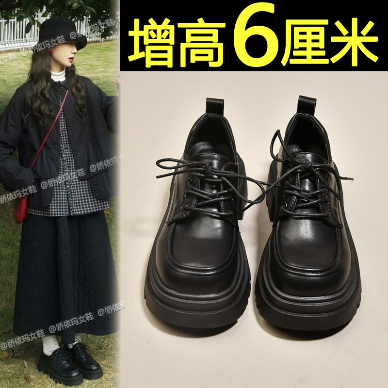 厚底黑色小皮鞋女2025新款秋冬英伦风松糕乐福鞋增高系带方头单鞋