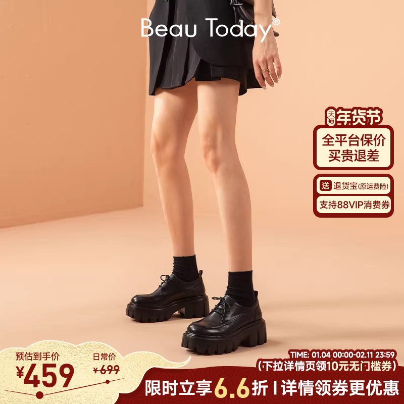 BeauToday厚底小皮鞋女英伦风乐福鞋松糕鞋真皮黑色单鞋增高鞋女