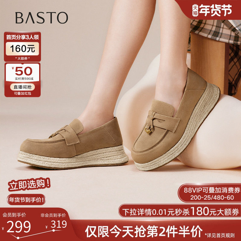 百思图25秋新款一脚蹬草编渔夫鞋厚底乐福鞋女松糕鞋单鞋B0515CA5
