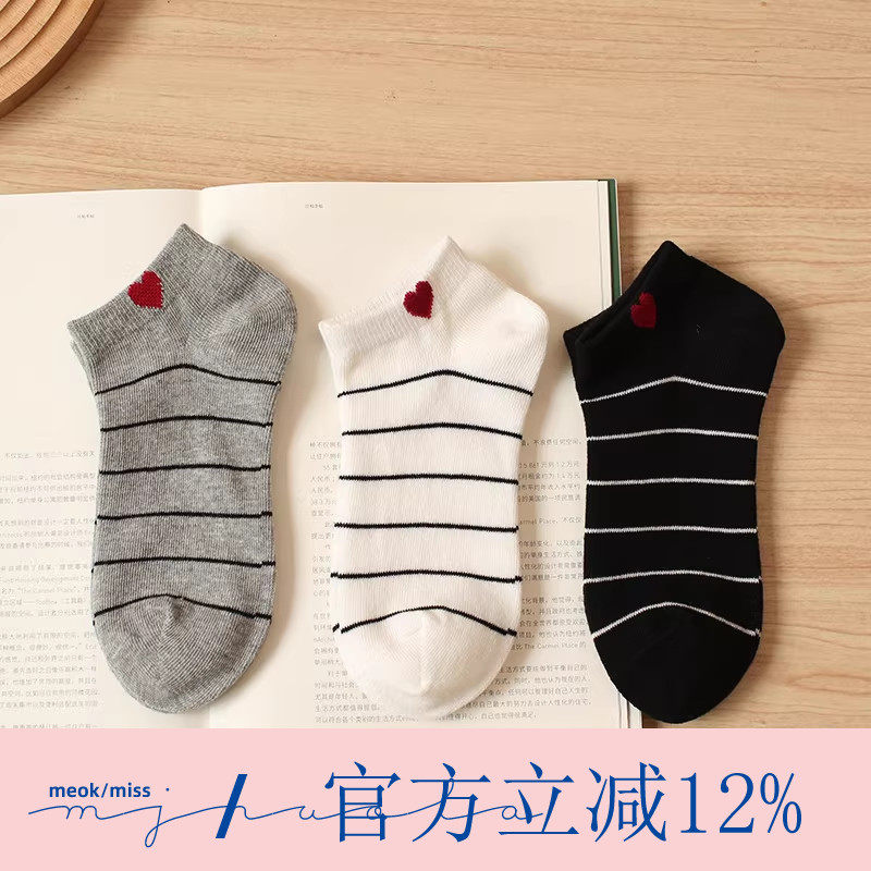 爱心条纹潮运动纯棉短筒袜女夏季吸汗透气防臭学院风低帮船袜子组