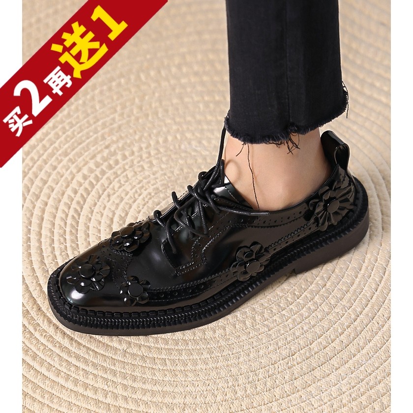 BEAU英伦风小皮鞋女夏季加绒系带牛津鞋平底单鞋黑色布洛克女鞋子