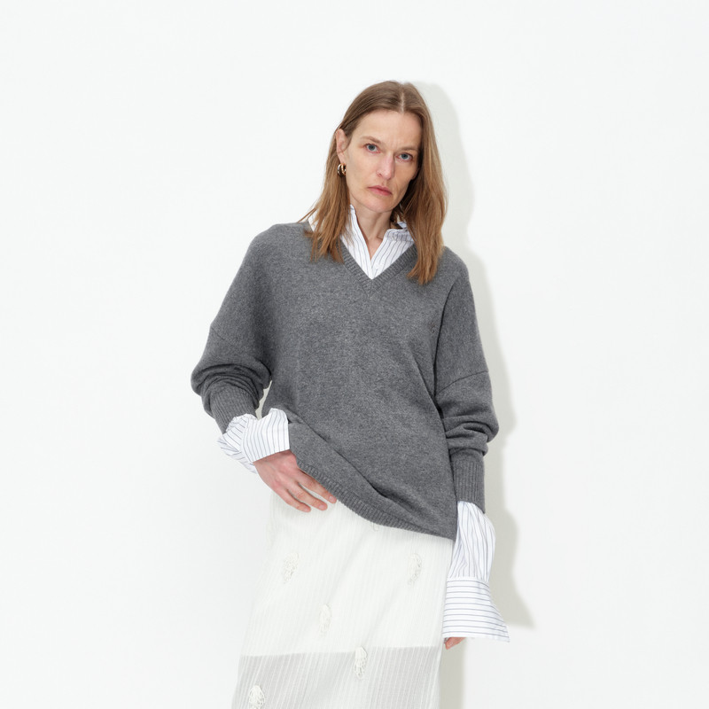 7AM10PM 全羊毛高级灰色V领毛衣 针织衫女叠穿上衣 百搭套头毛衣
